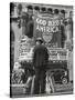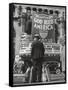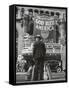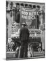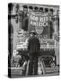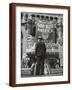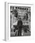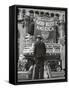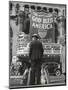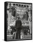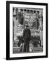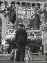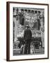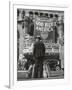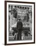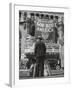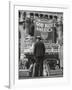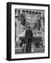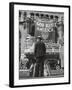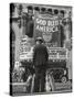Man with Shopping Bags in Front of Million Dollar Theatre Emblazoned with God Bless America Banner