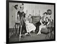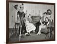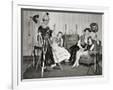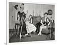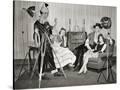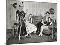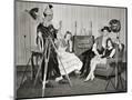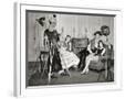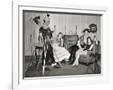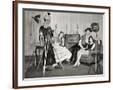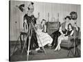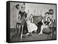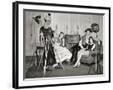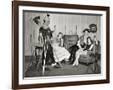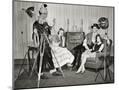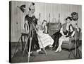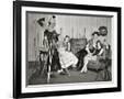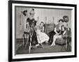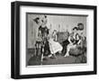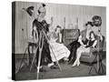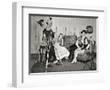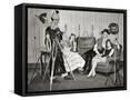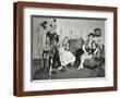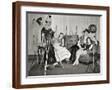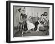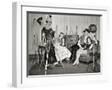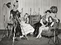 1940s GROUP OF YOUNG ADULTS COUPLES POSING WEARING PARTY COSTUMES MAN IN CLOWN COSTUME OPERATING...