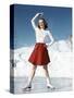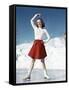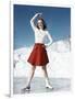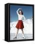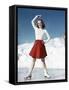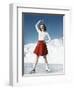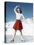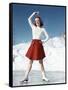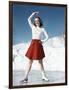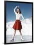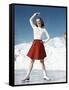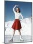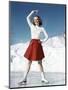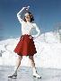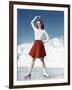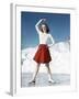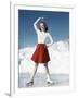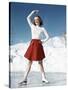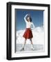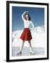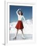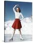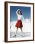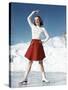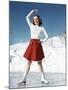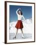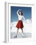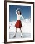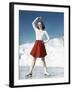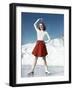 1950s SMILING WOMAN WEARING WHITE SWEATER RED SKIRT ICE SKATING POSING WITH ARM OVER HEAD