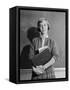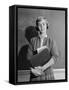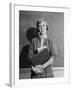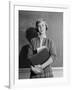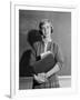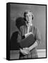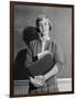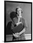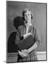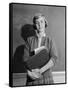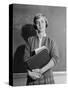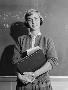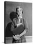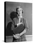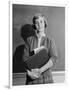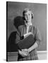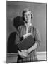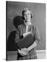 1960s TEENAGE GIRL HOLDING SCHOOL BOOKS STANDING IN FRONT OF BLACKBOARD LOOKING AT CAMERA