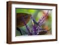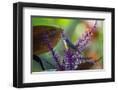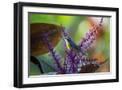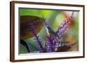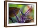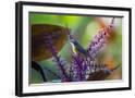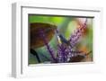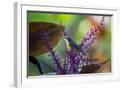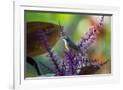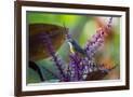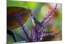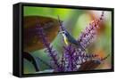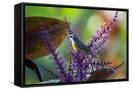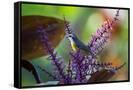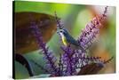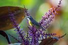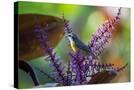 A Bananaquit Feeds from a Purple Flowering Plant in the Atlantic Rainforest