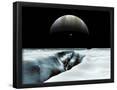 A Crescent Jupiter and Volcanic Satellite, Io, Hover over the Horizon of the Icy Moon of Europa Photo Print