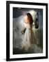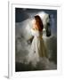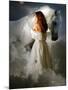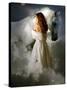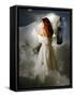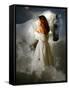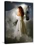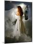 A Young Girl Wearing a White Dress Standing Beside a Horse under the Moonlight