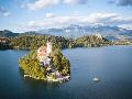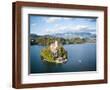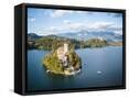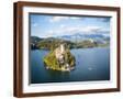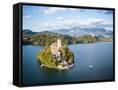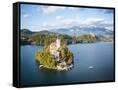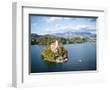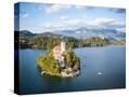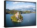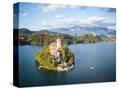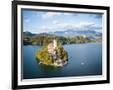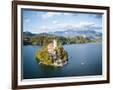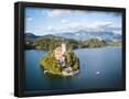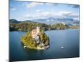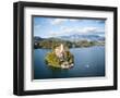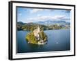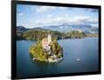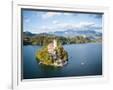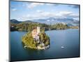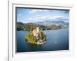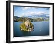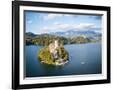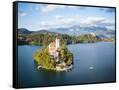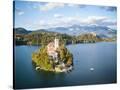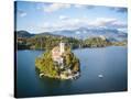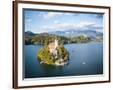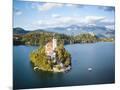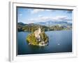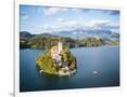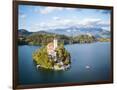 Aerial view by drone of Bled Island with the Church of the Assumption at dawn, Slovenia Photo Print