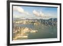 Aerial view of Hong Kong skyline and Victoria Harbor with blue sky in Hong Kong. Asia