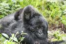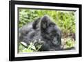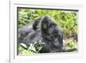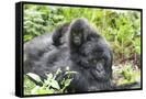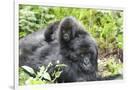 Africa, Rwanda, Volcanoes National Park. Mother mountain gorilla with its young playing on its back