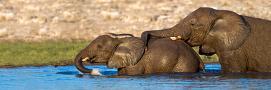 African Elephants (Loxodonta Africana) Bathing at Waterhole, Etosha National Park, Namibia