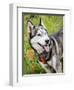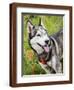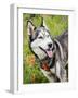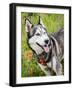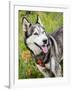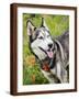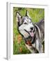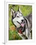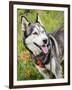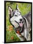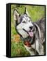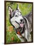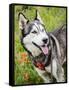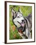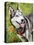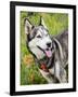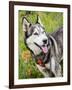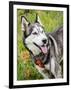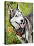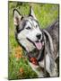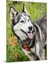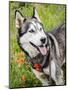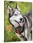 Alaskan Husky dog among wildflowers.
