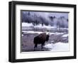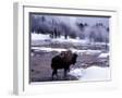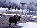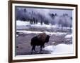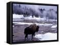 American Bison Walking along Edge of Wintry Thermal Pool, Yellowstone National Park, Wyoming, USA