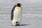 Antarctica, Snow Hill. A very small chick sits on its parent's feet.