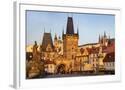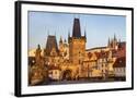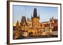 Arch of Lesser Town Bridge Tower on Charles Bridge with St. Nicholas Church in Prague.