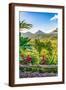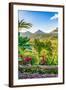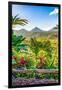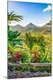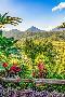 Bali, Indonesia. Lush tropical growth with three volcanos in the distance.