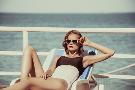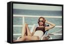 Beautiful Brown Hair Woman Wearing Bikini. Young Girl Model in Sunglasses and Elegant Black and Whi