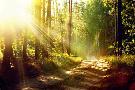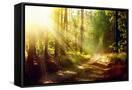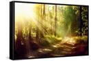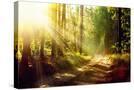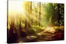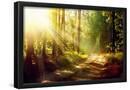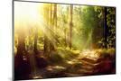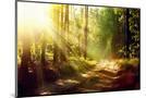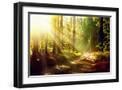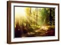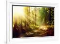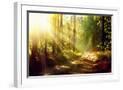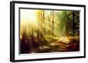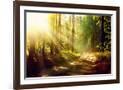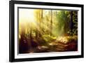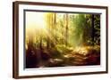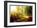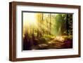 Beautiful Scene Misty Old Forest with Sun Rays, Shadows and Fog Photo Print