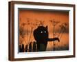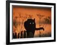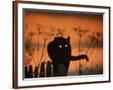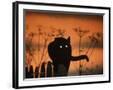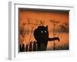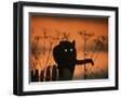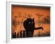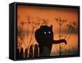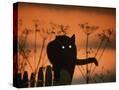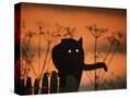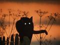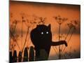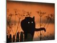 Black Domestic Cat Silhouetted Against Sunset Sky, Eyes Reflecting the Light, UK