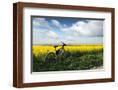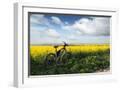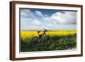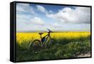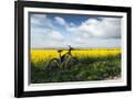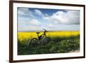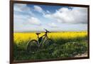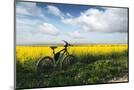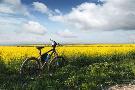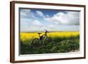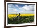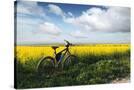 Black male bike on blooming yellow rapeseed field. Breathable landscape with blue cloudy sky at rur