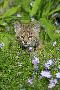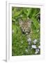 Bobcat (Lynx rufus) eight-weeks old cub, sitting amongst wildflowers in meadow, Montana, USA