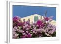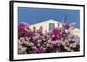 Bougainvillea and Yellow Building with Green Shutters Against Blue Sky