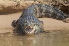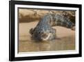 Brazil, The Pantanal. Portrait of an open-mouthed black caiman on the river bank.