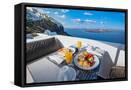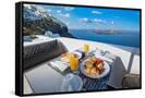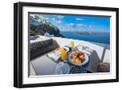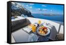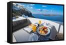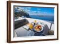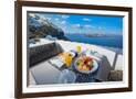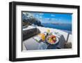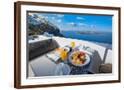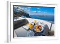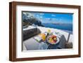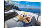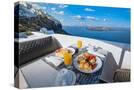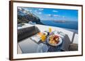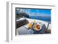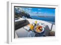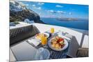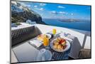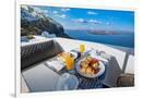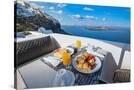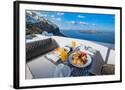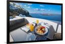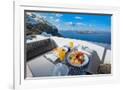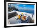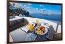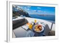 Breakfast time in Santorini in hotel. Luxury mood with fresh omelet and fruits with juice over sea Photo Print