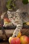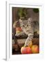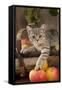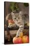British Shorthaired Kitten Laying on Basket of Apples