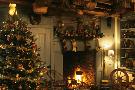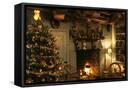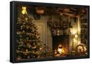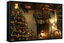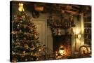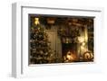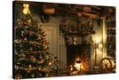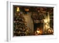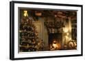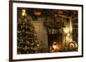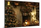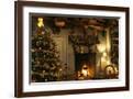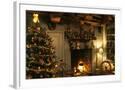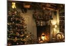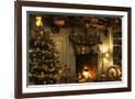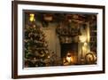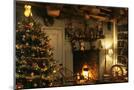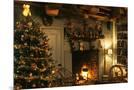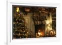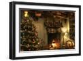 CHRISTMAS TREE AND COLONIAL STYLE FIREPLACE DECORATED WITH STOCKINGS Photo Print