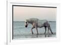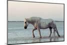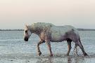 Camargue Horse, adult, walking in water at sunset, Saintes Marie de la Mer