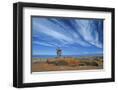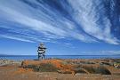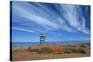 Canada, Manitoba, Churchill. Inukshuk on rocky shore of Hudson Bay.