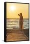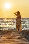 Charming woman contemplating the sea at sunset standing on Matala beach, Crete