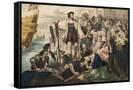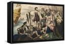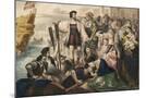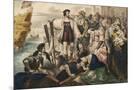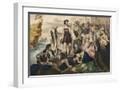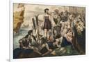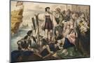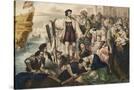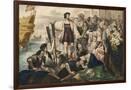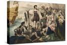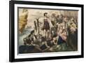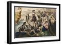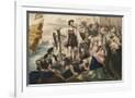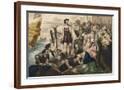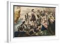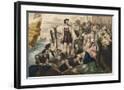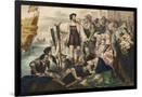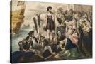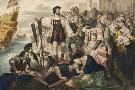 Christopher Columbus and his crew leaving the port of Palos, Spain, for the New World.