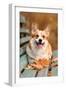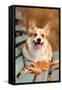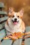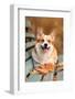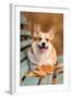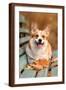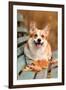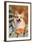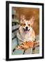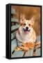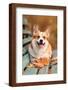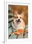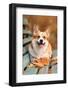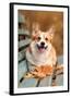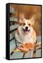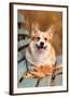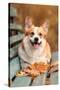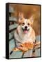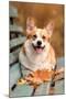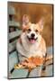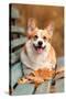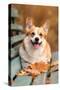 Close up Portrait of Happy Welsh Corgi Pembroke Breed Dog Lying on Bench with Fallen Leaves at Autu Photo Print