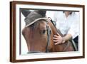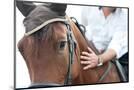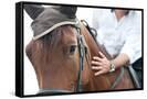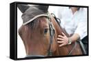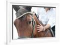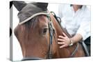 Closeup of a Horse Head with Detail on the Eye and on Rider Hand. Harnessed Horse Being Lead