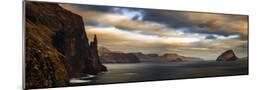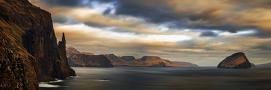 Coastal landscape with Witch Finger rock and Koltur island at sunset, Faroe Islands, Denmark