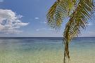 Coconut palm fronds hang down over the shore along the beach at San Juan, Siquijor, Philippines, So