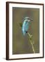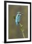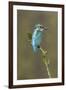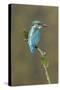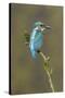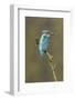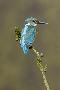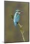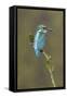 Common Kingfisher (Alcedo atthis) adult male, perched on mossy twig, Suffolk, England