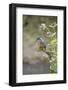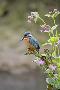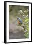 Common Kingfisher (Alcedo atthis) adult male, perched on twig amongst Red Campion flowers, England