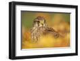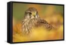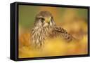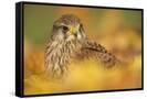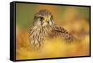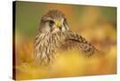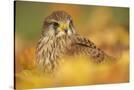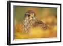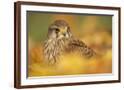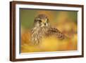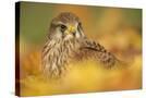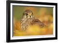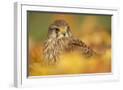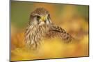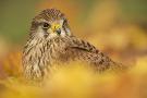 Common kestrel (Falco tinnunculus), among autumn foliage, United Kingdom, Europefoliage.
