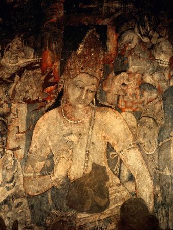 Detail of Mural Inside the Cave #1, Ajantain Maharashtra, India- Boddhisatva Holding a Lotus