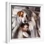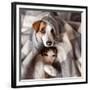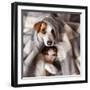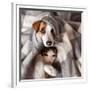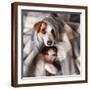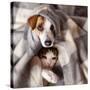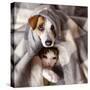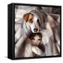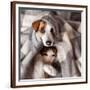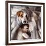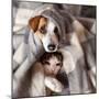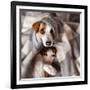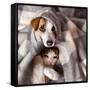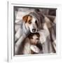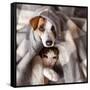 Dog and Cat under a Plaid. Pet Warms under a Blanket in Cold Autumn Weather Photo Print