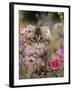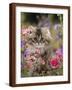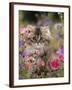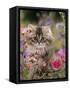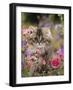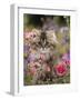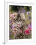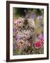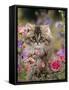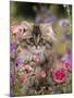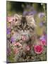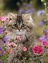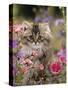 Domestic Cat, Portrait of Long Haired Tabby Persian Kitten Among Dwarf Roses and Bellflowers
