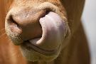 Domestic Cattle, Limousin cow, close-up of muzzle, licking nose
