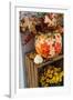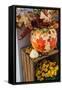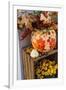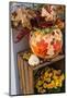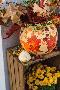 Entrance, wooden boxes, autumnal decoration, pumpkins, flowers,