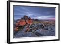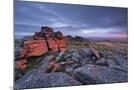 First light at sunrise glows against Belstone Tor, Dartmoor National Park, Devon, England. Summer (