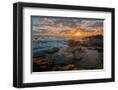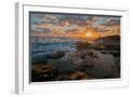 Fisherman fishing off rocks at sunrise, Queensland, Australia