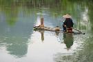 Fisherman on bamboo raft on Mingshi River with karst hills, Mingshi, Guangxi Province, China