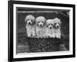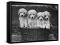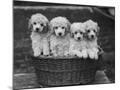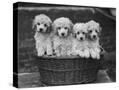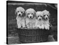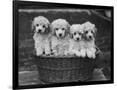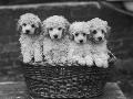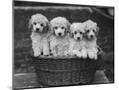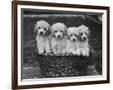 Four "Buckwheat" White Minature Poodle Puppies Standing in a Basket