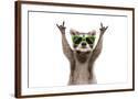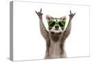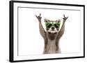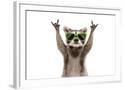 Funny Raccoon in Green Sunglasses Showing a Rock Gesture Isolated on White Background