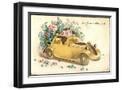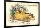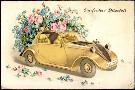 Glückwunsch Ostern, Küken in Einem Oldtimer, Blumen