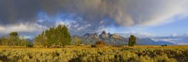 Historic Barn, Mormon Row and Teton Mountain Range, Grand Teton National Park, Wyoming, USA