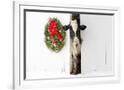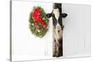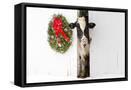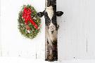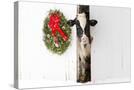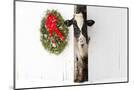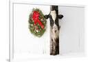 Holstein Cow in Snowstorm by Green Wreath and Red Ribbon, St. Charles, Illinois, USA